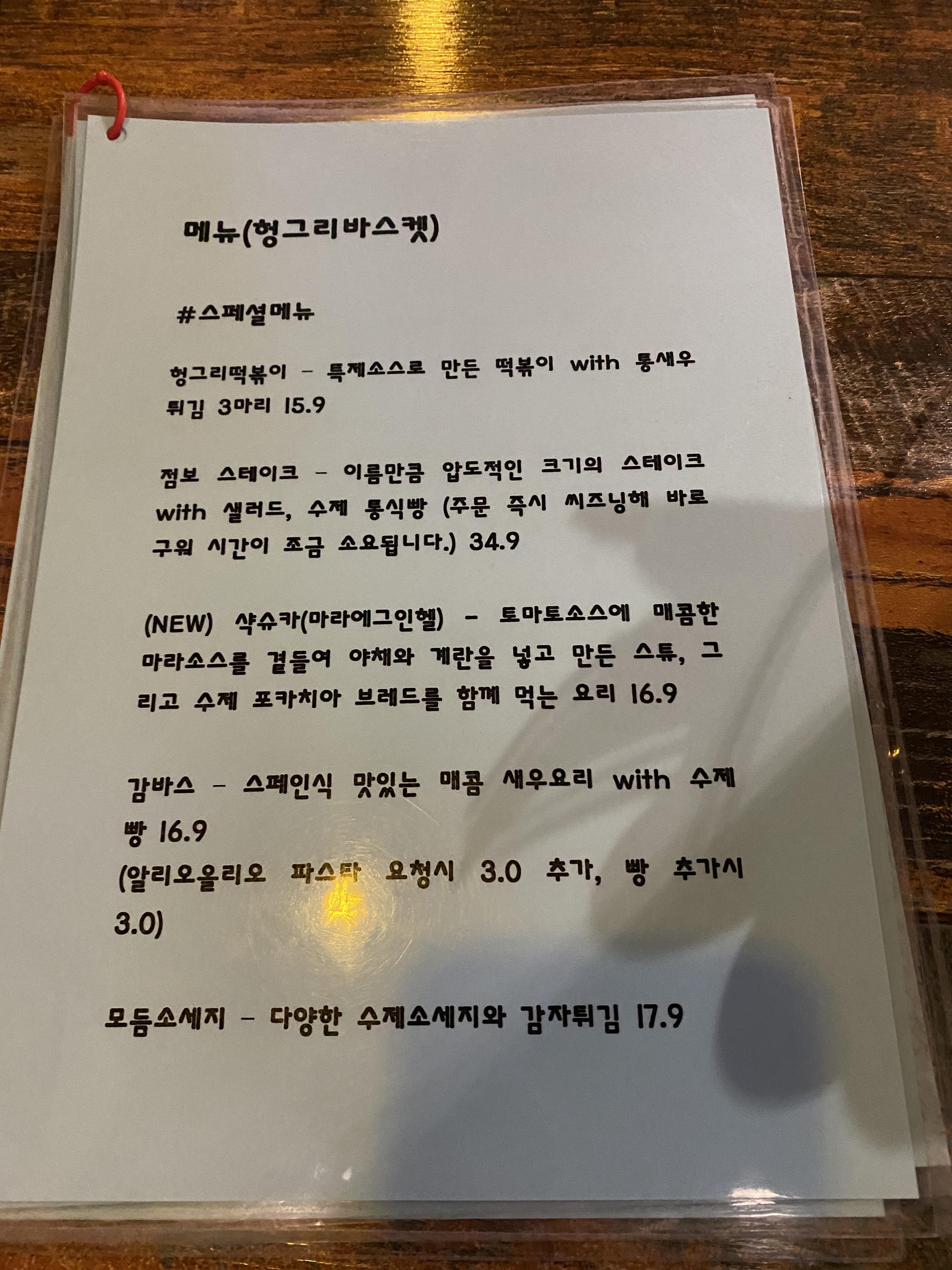 헝그리바스켓 메뉴판은 독특하게 되어있습니다. 이미지는 첨부가 안 되어있으며, 글로만 설명이 되어있습니다.