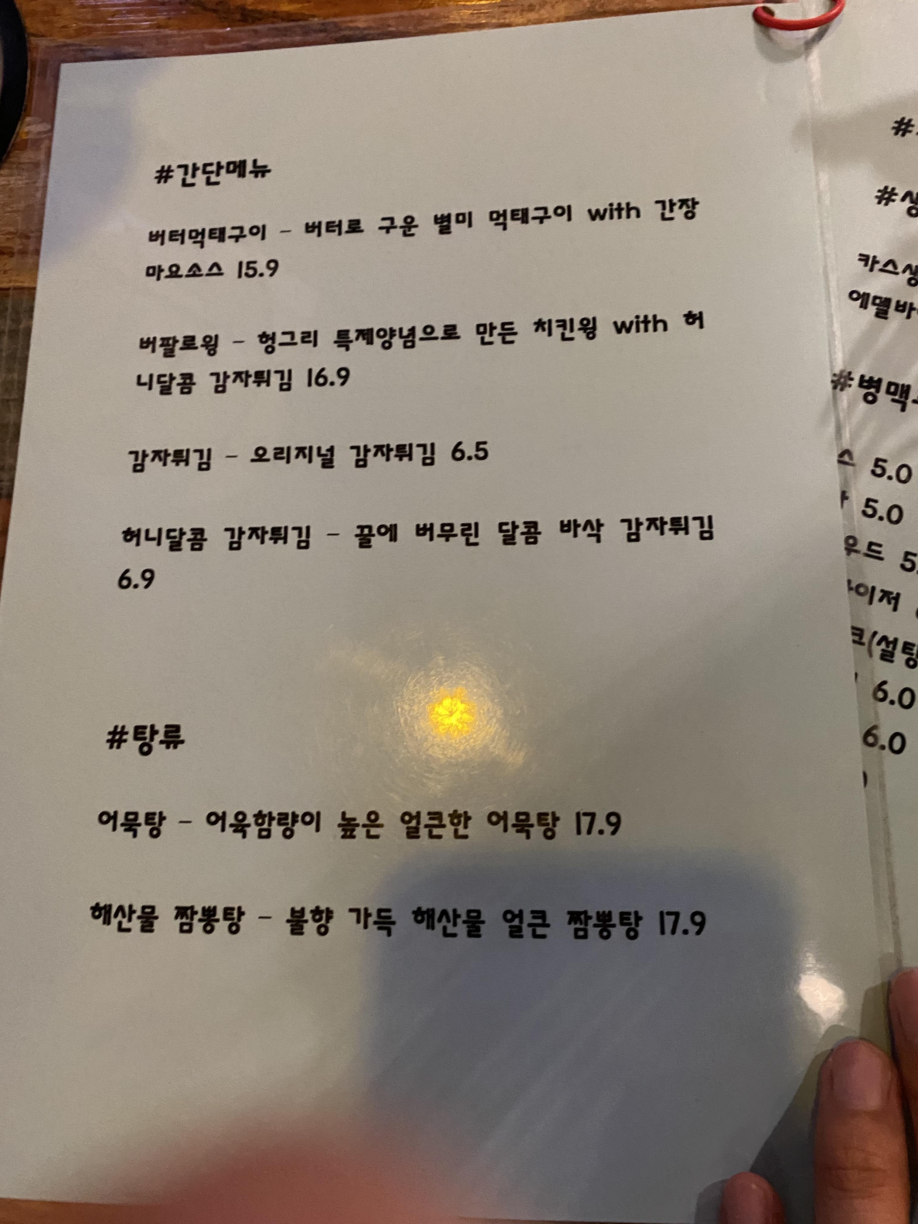 간단 메뉴는 버터먹태구이, 버팔로윙, 감자튀김, 허니달콤 감자튀김 / 탕류에는 어묵탕, 해산물 짬뽕탕이 있습니다.