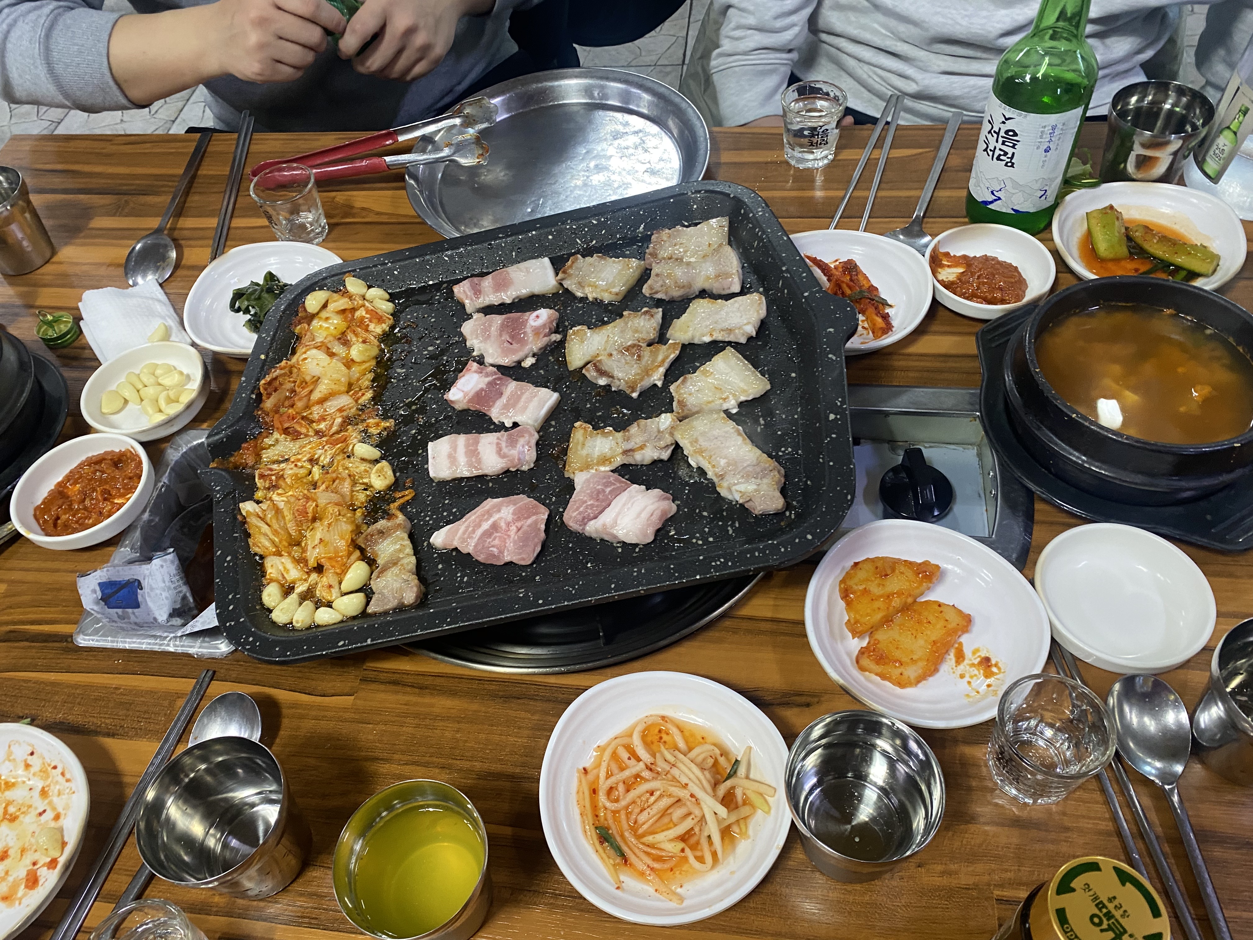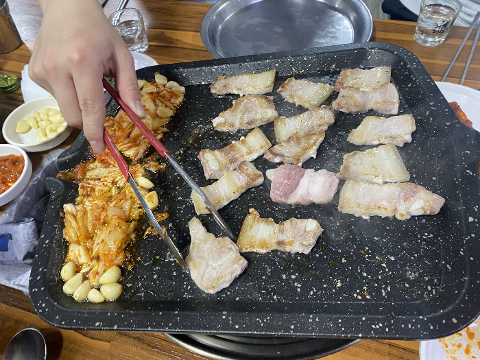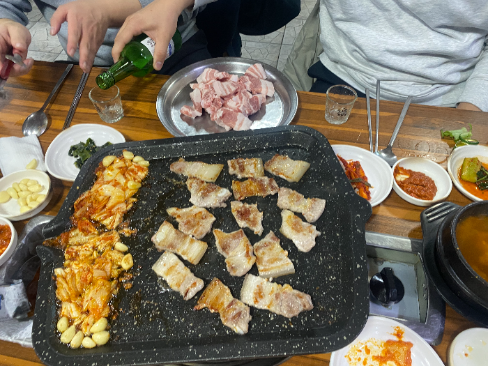 삼겹살을 열심히 구워서 구운김치와 구운 마늘과 야채와 함께 쌈장을 찍어 먹으면 알고 있는 맛이지만 맛있습니다. 기본에 충실한 오복식당입니다.. 그래서 아마 많은 사람들이 27년 동안 찾아오는 거 같습니다.