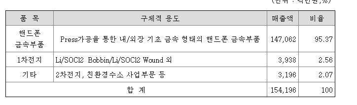 이중 핸드폰 금속부품 사업부문은 갤럭시 시리즈, 폴드, 플릭, 힌지 등을 비롯한 휴대폰 부품들로 구성되어 있어서, 국내와 해외, 베트남에서 사업을 영위하고 있습니다.