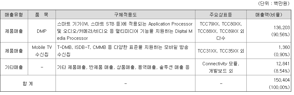 다양한 응용 제품 내에서 주요 기능의 핵심제어, Multimedia, 그래픽, Connectivity 및 사용자의 인터페이스 등의 메인 기능을 담당하는 Application Processor(이하 AP라 한다), 각종 모바일방송 표준을 지원하는 모바일 TV 수신칩 그리고 블루투스, WiFi, GPS 등 셋톱박스 및 차량에 사용되는 Connectivity 모듈을 개발 및 판매하고 있습니다.
