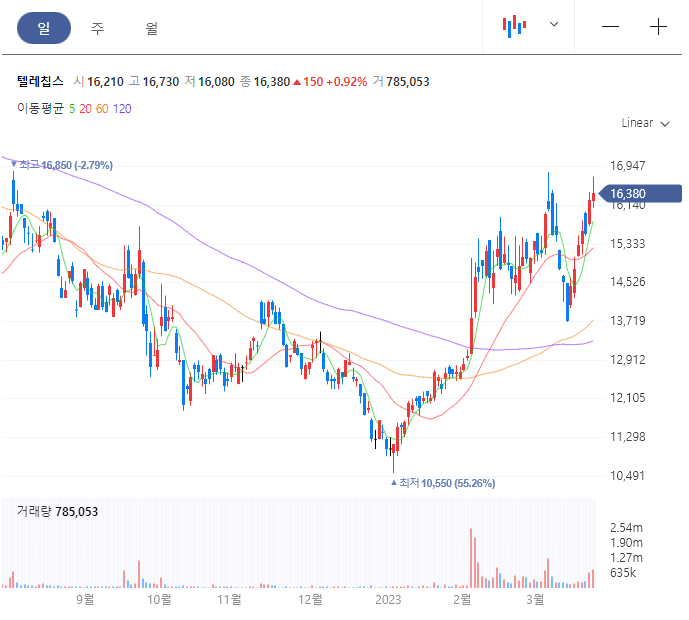텔레칩스 일봉차트를 보시면 최근 바닥권에서 거래대금과 함께 60일선이 120일선의 골든크로스가 발생하면서 상승추세전환을 하고 있는 모습입니다. 실적, 미래산업등으로 봤을때 텔레칩스는 우상향 할 수 있는 좋은 회사인 거 같습니다.