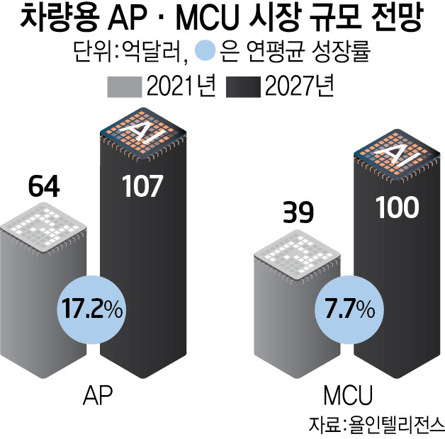 시장조사업체인 욜인텔리전스 자료를 보면 차량용 반도체 시장은 2027년까지 약 104조원에 달할 것으로 예상이 되며, 이중 텔레칩스가 추진하고 있는 사업인 AP분야는 130조 원까지 커질 것으로 예상되고 있습니다. 이는 연평균 17.2%에 달하는 높은 성장률로 기대가 큰 차세대 시장입니다.