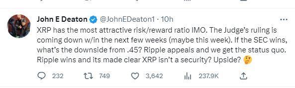 리플(XRP) 커뮤니티를 대변하는 미국 변호사 존 디튼(John E Deaton)이 트위터를 통해 "내가 보기에 현재 가격대의 XRP의 위험/보상 비율은 매력적이라고 합니다. 리플과 미 증권거래위원회(SEC) 간 소송 판결이 수주 내 나올 것입니다. 이번주가 될 수도 있다. SEC가 승소해도 0.45 달러인 XRP에 큰 타격이 있을까. 리플은 항소할 것이고 XRP 가격은 유지될 것입니다. 만약 리플이 이기고 XRP가 증권이 아닌 것으로 결론 나면 얼마나 오를까"라고 말했습니다. 리플 소송을 지속적으로 추적해 온 미국 연방 검사 출신 변호사 제임스 K. 필란도 3월 31일 전까지 리플-SEC 약식판결이 종결될 것이라고 전망한 바 있습니다.