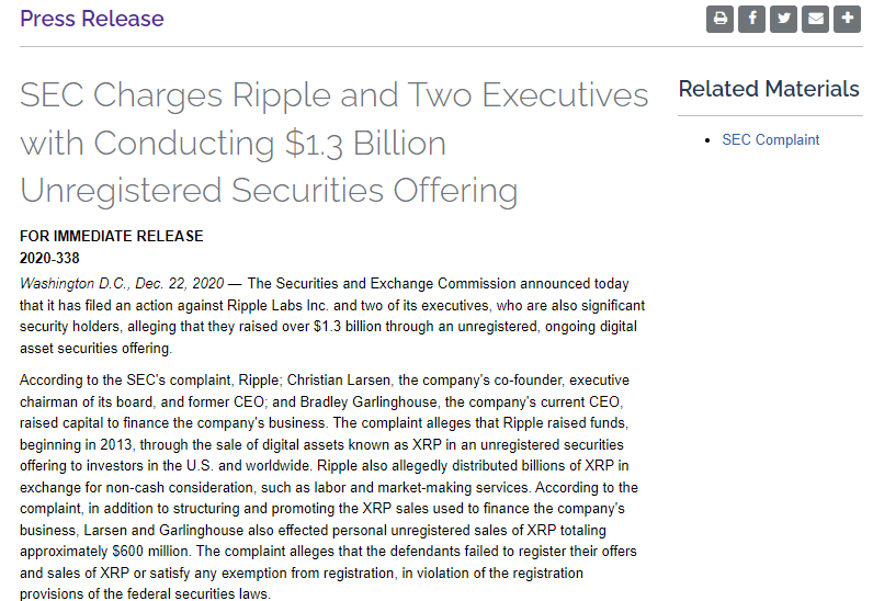 간단하게 설명을 드리자면 2020년 12월 22일에 미국 증권거래위원회(SEC)측에서 리플 임원 2명에 대하여 소송을 제기하면서 리플의 주가는 폭락하는 사태가 발생했습니다.