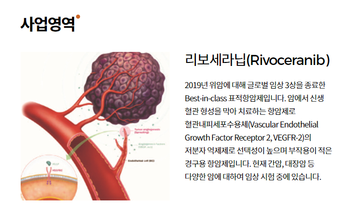 전 세계적으로 6,000명 이상의 환자를 대상으로 연구되었으며 다른 TKI 및 VEGF 억제제와 비슷한 안전성 프로파일로 임상 시험에서 내약성이 우수했습니다. 리보세라닙은 현재 다양한 고형 종양 적응증에서 단일 요법 및 화학 요법 및 면역 요법과의 병용 요법으로 연구되고 있습니다.® ). 위암(미국, EU 및 한국), 선양 낭성 암종(미국) 및 HCC(미국)에서 희귀 의약품 지정이 승인되었습니다. Elevar는 글로벌 권리(중국 제외)를 보유하고 있으며 한국에서 HLB-LS와 리보세라닙의 개발 및 마케팅을 위해 제휴했습니다. 리보세라닙은 apatinib이라는 이름으로 현재 중국에서 진행성 위암과 2차 진행성 HCC에 대해 중국 영토 라이선스 보유자인 Hengrui Pharma에 의해 Aitan이라는 브랜드 이름으로 승인되었습니다.