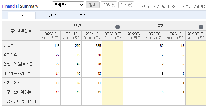 재무제표를 보시면 시가총액 6,600억 원에 달하는 회사 규모의 비하여 매출액이 낮은 것을 알 수 있습니다. 이는 신규상장주의 특징으로 미래성장가치를 반영한 결과로 판단됩니다.
