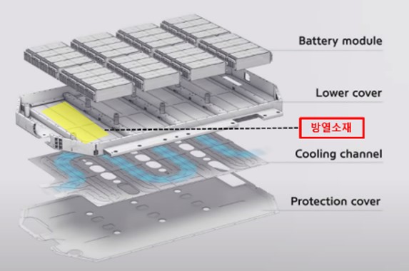 두 번째는 열 폭주 차단 패드입니다. 또 다른 말로는 화재 지연 장치로서 배터리 전체 바깥면에 부착되어서 화재가 발생했을 시 상당 기간 화염을 차단하는 역할을 합니다.