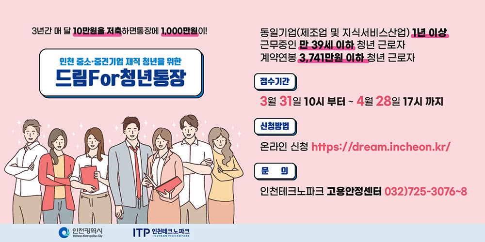 ※ 선정인원은 예산 상황에 따라 변동될 수 있으며, 최종선정 평가 시 확정 - 인천 소재 중소·중견 제조기업 및 지식서비스산업 기업 재직 청년에게 생애 1회 ‘드림For청년통장’ 지원