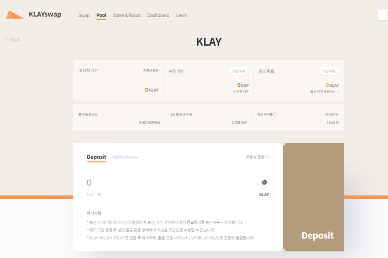클레이튼을 예치하면 지분율에 따라서 KSP코인을 수령 가능합니다.
