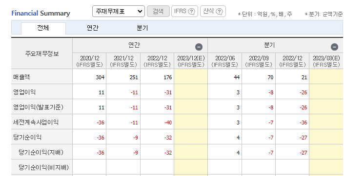 재무제표를 보시면 매출액이 감소하고 영업손실이 증가하고 있는 최악의 재무제표를 보이고 있습니다. 이에 대한 원인으로는 발주처의 본공사 지연, 원자재 가격 급등, 전환사채 파생상품평가손실 등의 원인으로 보이고 있습니다.