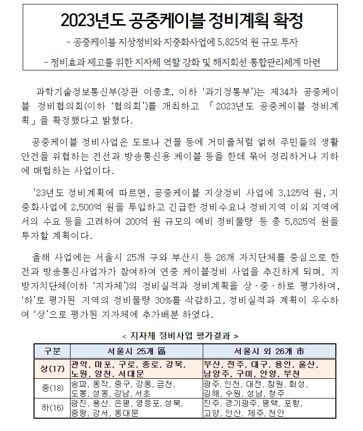 정부는 올해 공중케이블의 정리 작업에 5825억 원을 투입을 확정했다고 밝혔습니다. 공중케이블 정비사업은 도로나 거미줄처럼 얽혀 주민들의 생활 안전을 위협하는 전선과 방송통신용 케이블 등을 한데 묶어 정리하거나 지하에 매립하는 사업입니다.