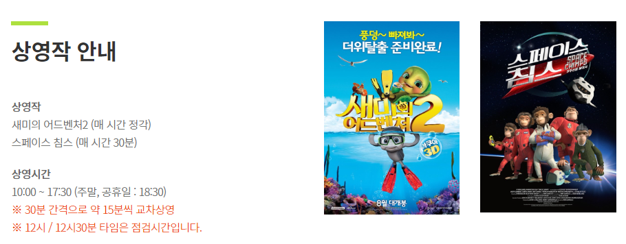 3D영화관에는 새미의 어드벤처2가 매 시간 정각에 상영을 하며, 스페이스 침스는 매 시간 30분에 상영을 합니다.