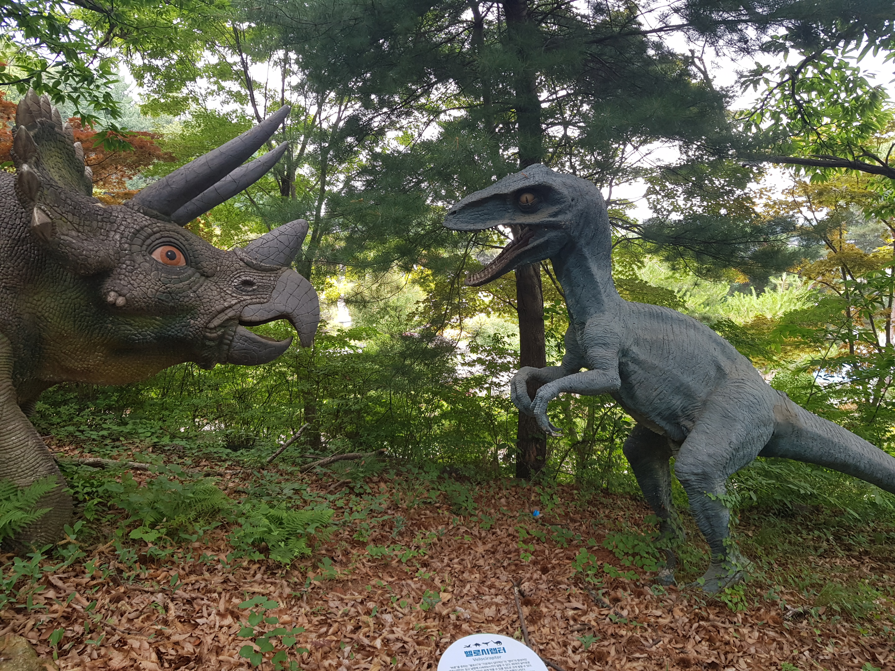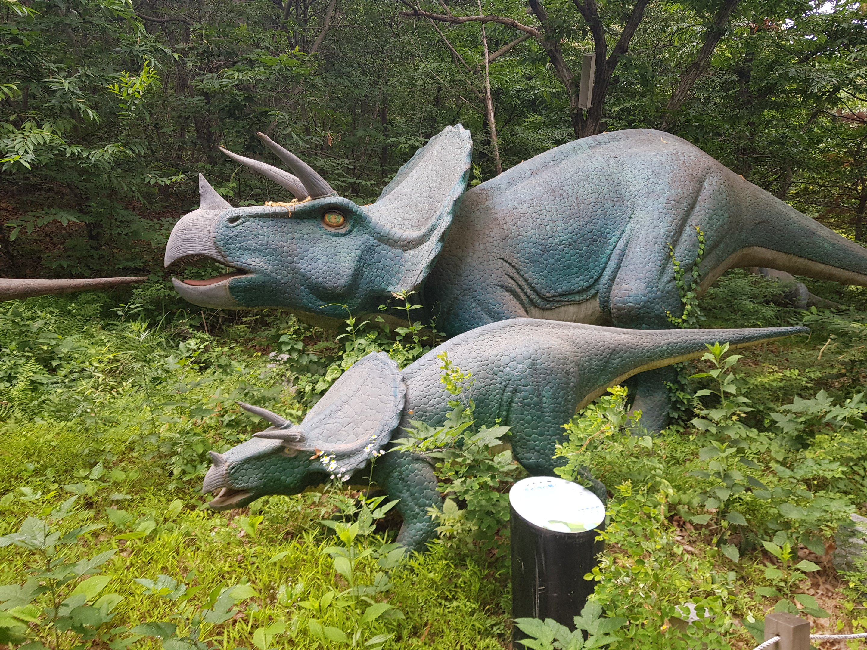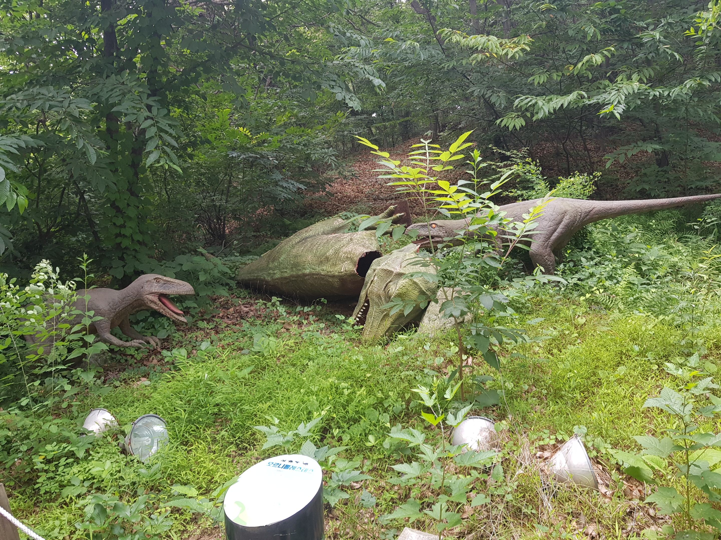 숲 속 중간중간에 공룡의 모형들이 있는데 딸이 너무 무서워 해서 사진을 같이 찍지는 못하고 멀리서 구경만 했습니다.