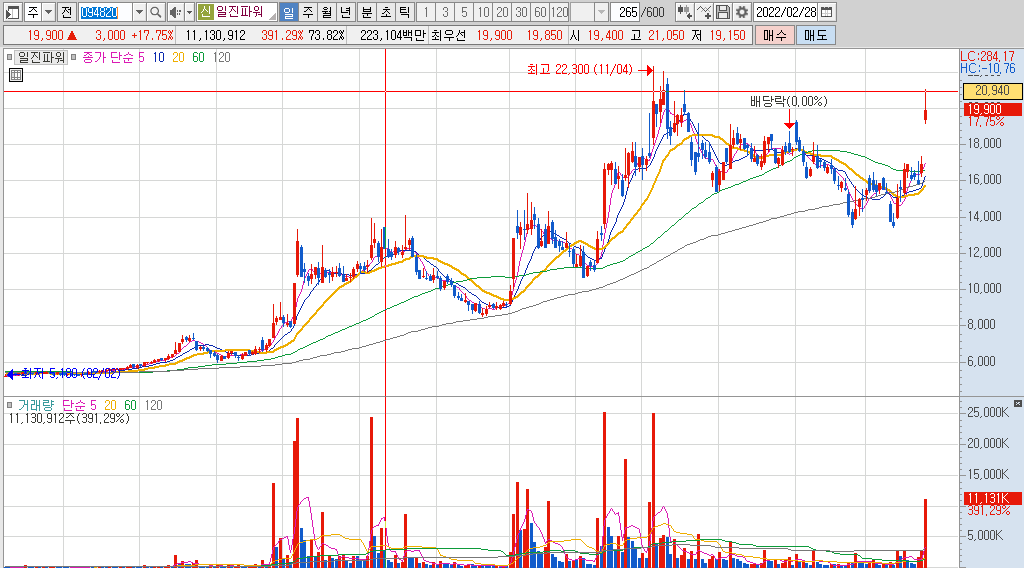 일진파워의 차트를 보면 전고점의 강한 저항대로 인하여 금일 꼬리를 단 모습입니다.