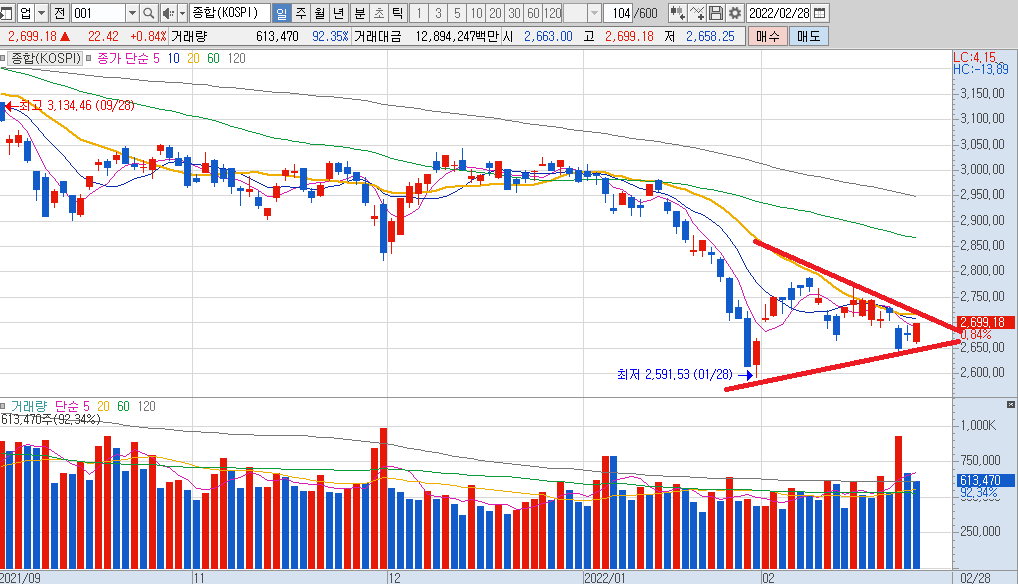 바닥권에서 나타난 삼각수렴 차트를 만들어나가고 있는 코스피 차트입니다.