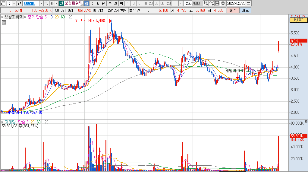 금일 시장에서 2,900억 원에 거래대금을 만들면서 상한가로 마감한 보성파워텍은