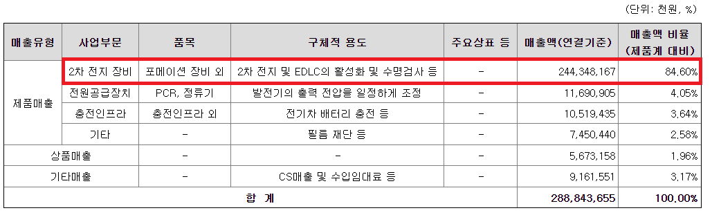 제품매출의 대부분인 84.60%가 2차전지 장비 포메이션 장비에서 발생하고 있습니다.