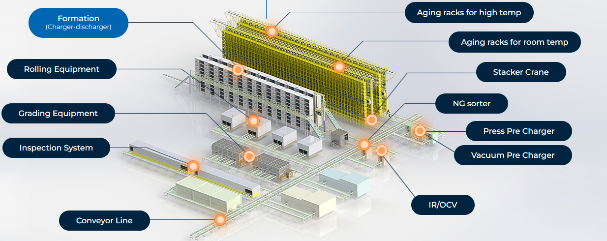 포메이션이란 충·방전 설비를 비롯하여 컨베이어 물류라인, 양품 판정을 위한 NG sorter, Grading Equipment에 이르기까지 배터리 생산 후공정 전 Line의 TURN-KEY 설계 및 생산이 가능합니다. 특히 전기차에 사용되는 중대형 배터리에 특화된 Solution을 가지고 있으며, 고온 가압/부압 솔루션 및 화재 감지 시스템 등을 통해 신뢰성 있는 장비를 납품하고 있습니다.
