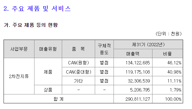 주요 제품 매출을 보시면 2차전지류 중 원형과 중대형으로 나뉘어 있습니다. 비슷하게 매출이 발생하고 있으며. 원형에서 더 큰 매출이 발생하고 있습니다. 참고로 원형은 휴대폰, 태블릭, 노트북, 전동공구 등 2차 전지의 케이스로서 전지의 내용물을 담는 용기를 말합니다.