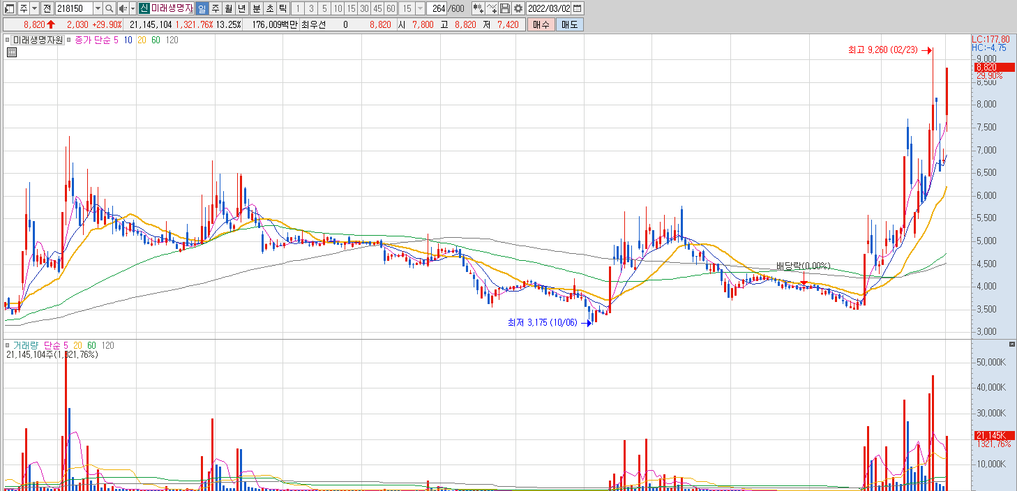 미래생명자원 차트를 보면 급등을 하는 모습을 보여주고 있고