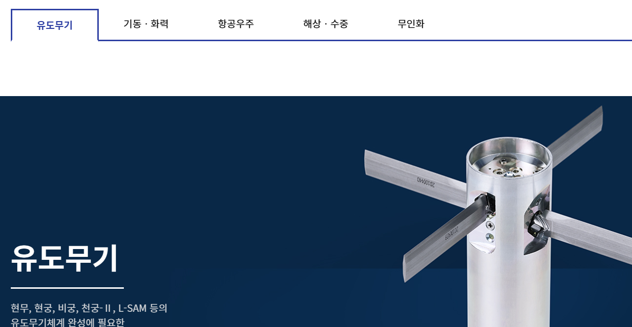 주요 제품으로는 유도무기, 기동 및 화력, 항공우주, 해상 및 수중, 무인화에 필요한 구성품을 생산하고 있습니다. 특히 구동장치, 전개장치, 유도조종장치, 발사통제장치, 전기전장, 환경제어, 소화장치, 항공전자 등을 생산하고 납품하고 있습니다.