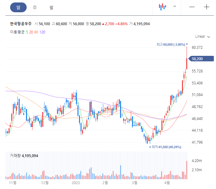 일봉차트를 보시면 최근 우주항공산업에 대한 기대감으로 선반영되서 상승을 했습니다. 하지만 조정이 불가피할거 같지만 추세는 안 무너질 것으로 보입니다.