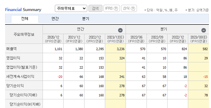 인텔리안테크는 2020년부터 급성장하는 우량기업입니다. 2020년부터 3년 만에 약 10배에 달하는 영업이익 증가를 보여주었습니다. 이는 상선, 크루즈, 오일가스 선박시장의 VSAT 안테나 수요 확대 및 신규 저궤도 안테나 양산시작으로 인하여 매출이 증가한 것으로 보이고, 향후 원웹과의 계약 체결로 꾸준하게 우상향 할 것으로 보입니다.