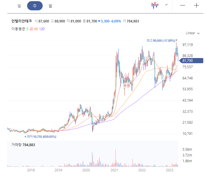 인텔리안테크 주봉을 보게 되면 쓰리봉을 형성후 조정을 받고 있습니다. 이는 조정이 불가피할 것으로 보이고 어디까지 하락할지 예측해야 합니다. 만약 하락을 하게 된다면 70,800원 부근까지 하락을 할 수가 있습니다. 이 부근에서 매수할 수 있다면 더 매수할 겁니다.