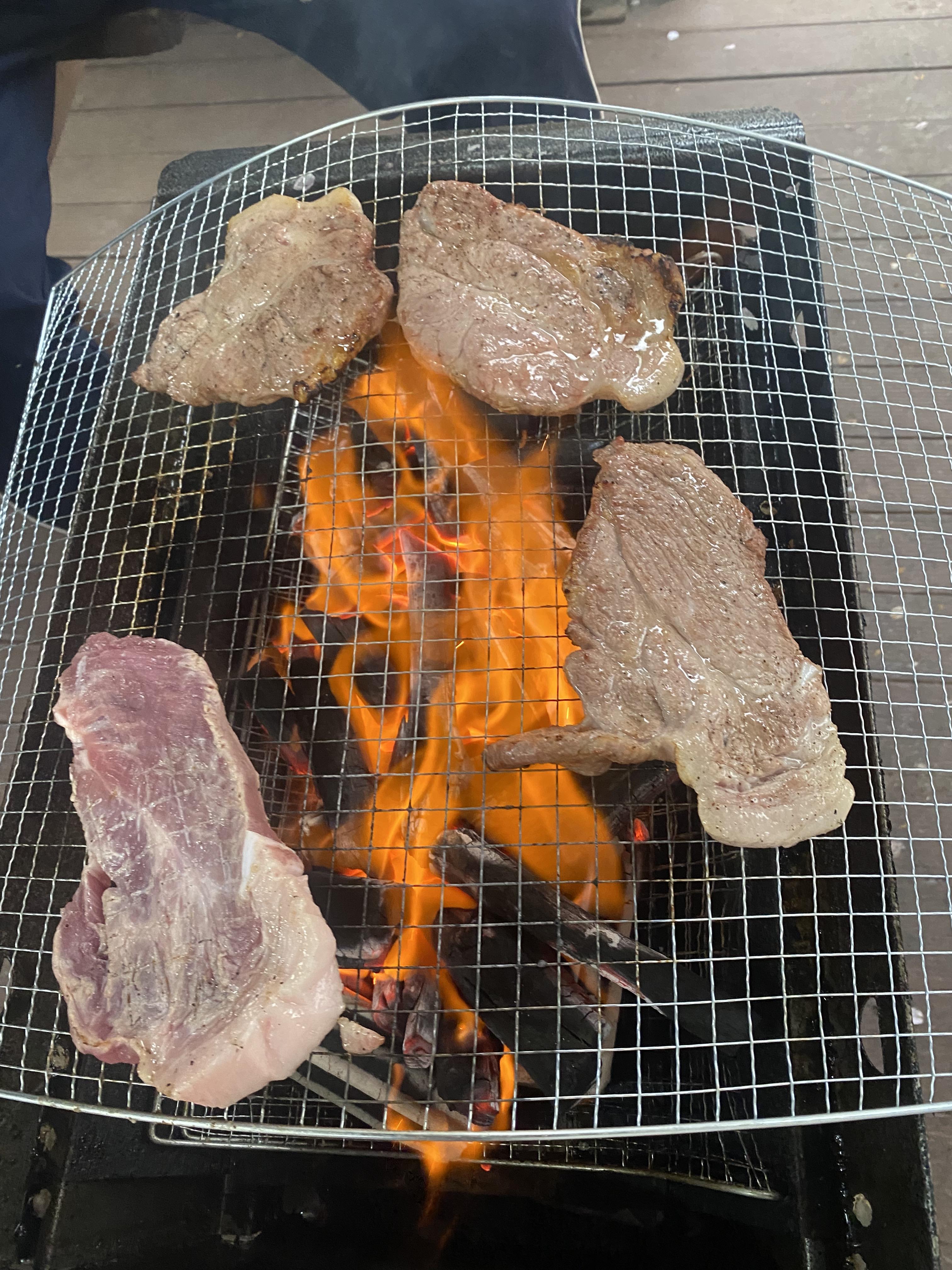 저희는 마늘, 양파, 소세지, 버섯 등을 추가해서 먹고 싶었지만 제공받은 불판으로는 너무 불편해서 따로 챙겨 온 버너에다가 삼겹살과 함께 구워서 먹었습니다. 아이들끼리 놀게 하고 남자들끼리 바베큐에 구운 고기에 술을 마시니 너무 행복했습니다.