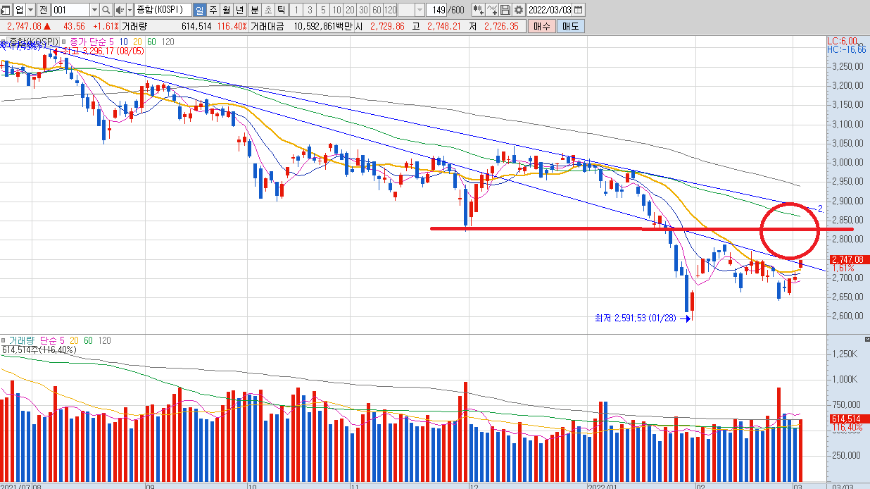 코스피 일봉 차트를 보시면 저항대를 연결했을 때 2,800포인트에 강력한 저항이