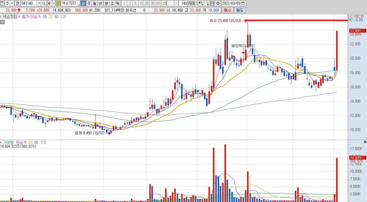 넥슨지티 일봉 차트를 보시면 역사적 신고가와 얼마 남지 않은 모습을 보이고 있으며,