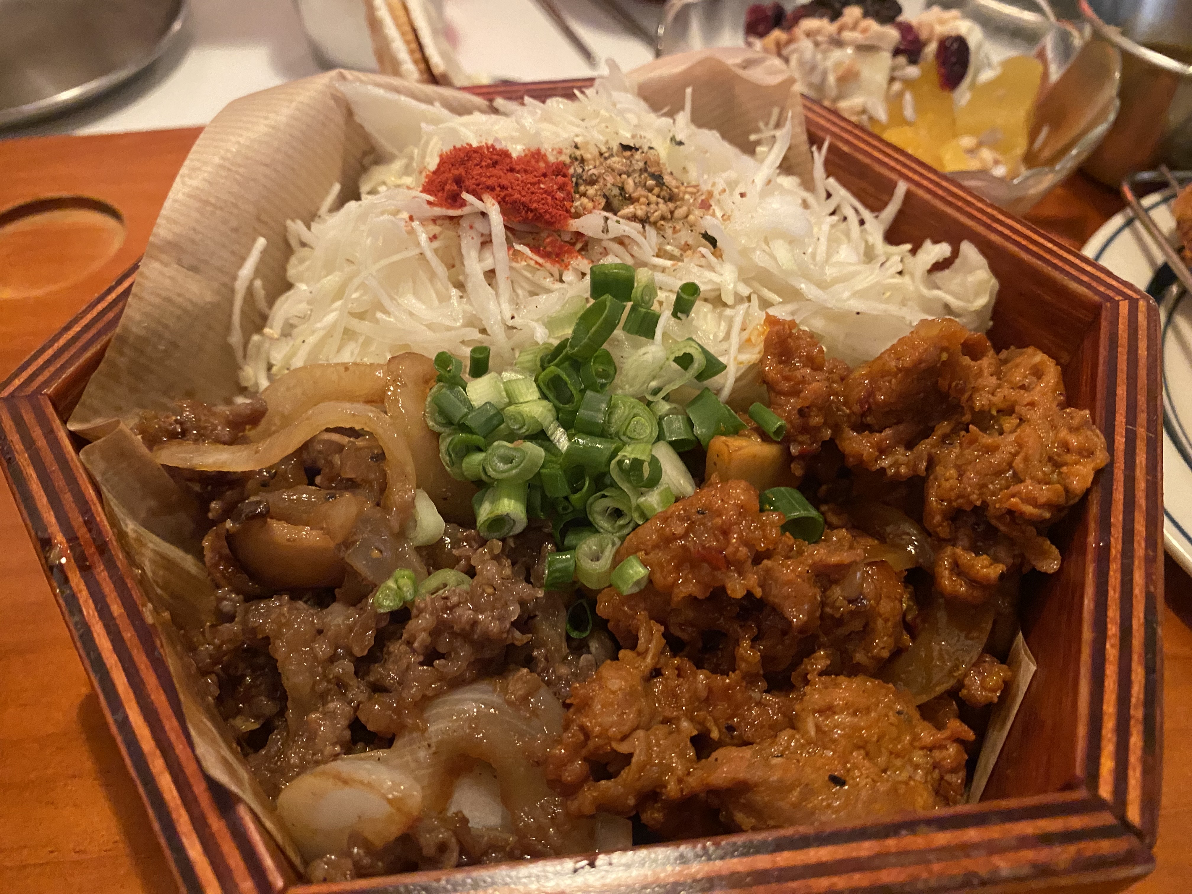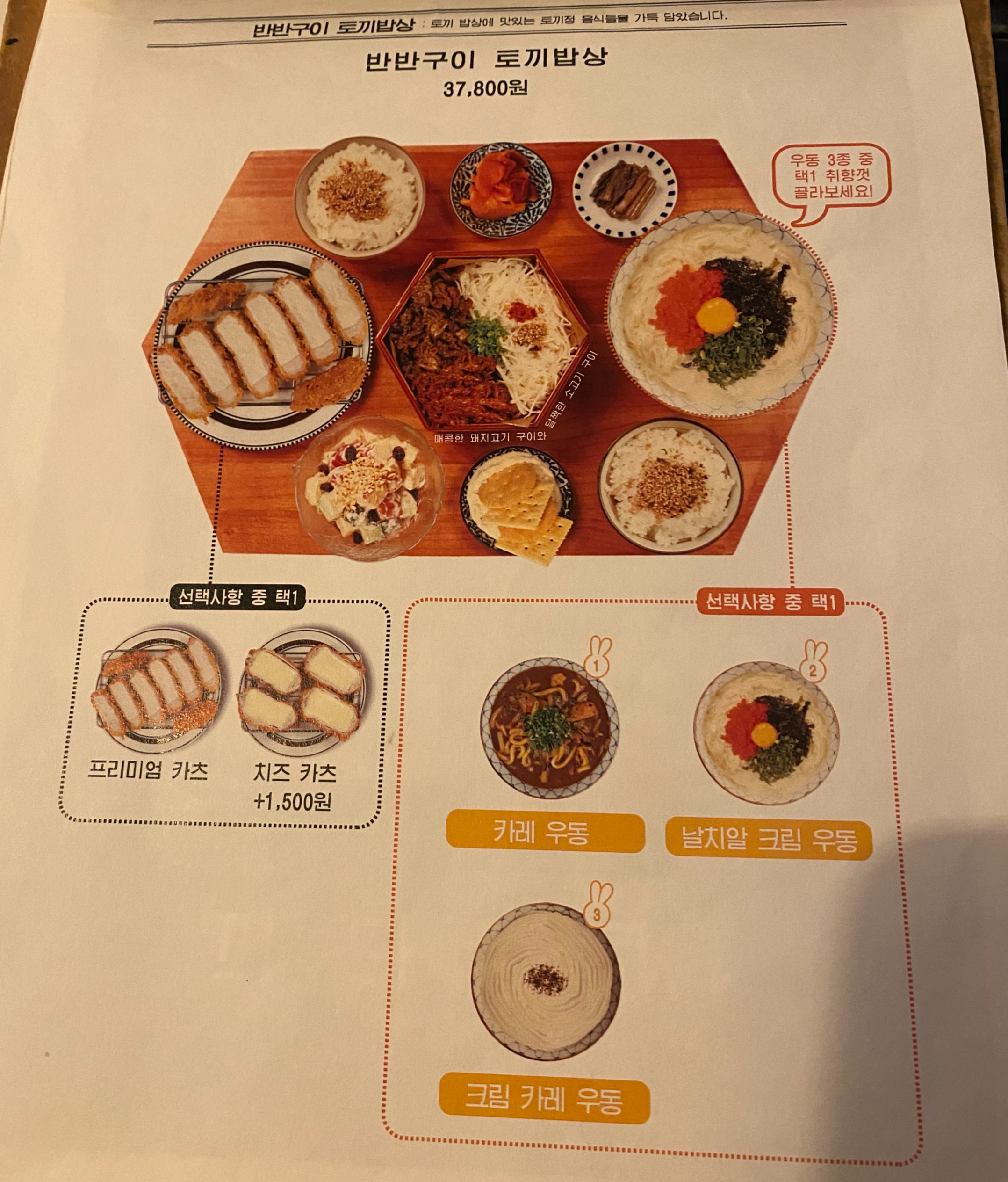 반반구이 토끼밥상은 매콤한 돼지고기랑, 담백한 소고기 구이와 돈까츠와 우동을 선택해서 먹을 수 있습니다.