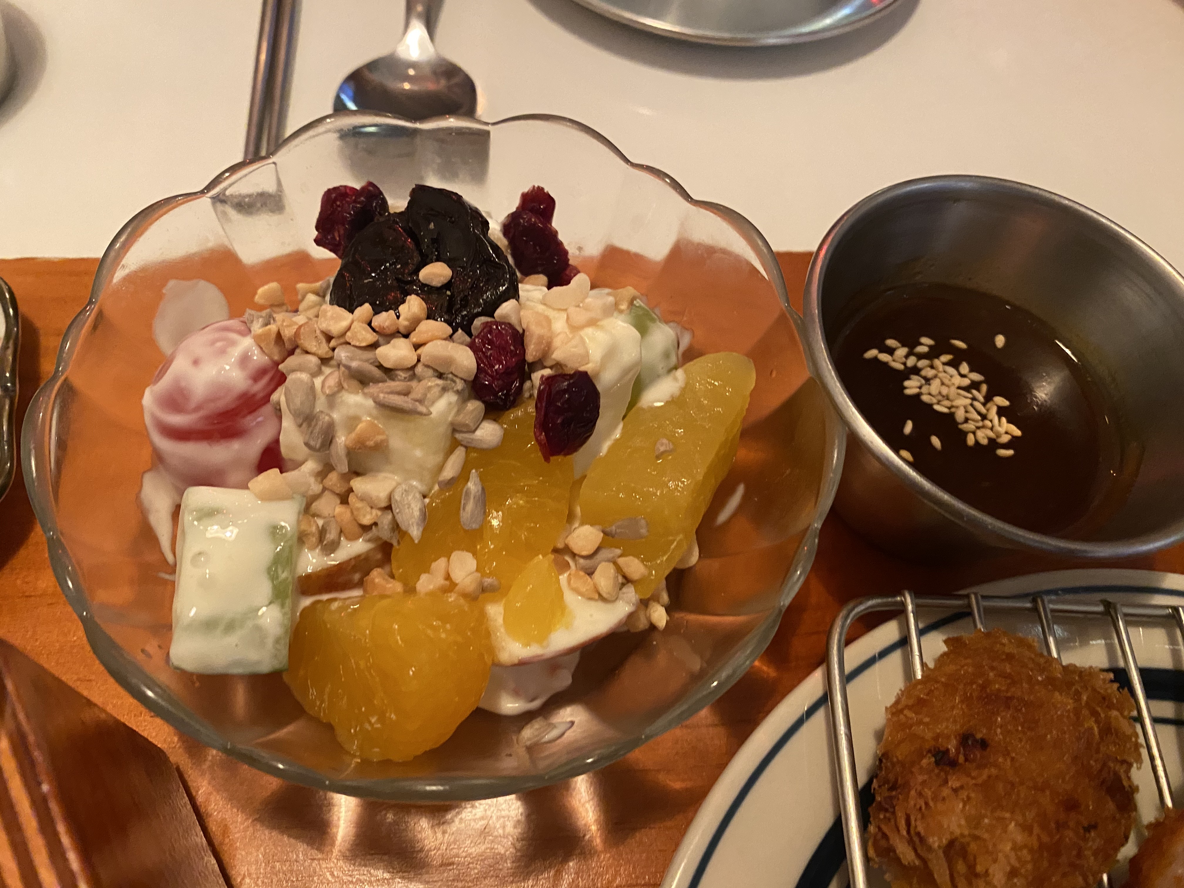 김치와 단무지, 크래커, 과일샐러드가 제공됩니다. 크래커는 치즈크림과 함께 찍어 먹으면 맛있습니다. 저는 별로였지만 와이프가 맛있다네요.