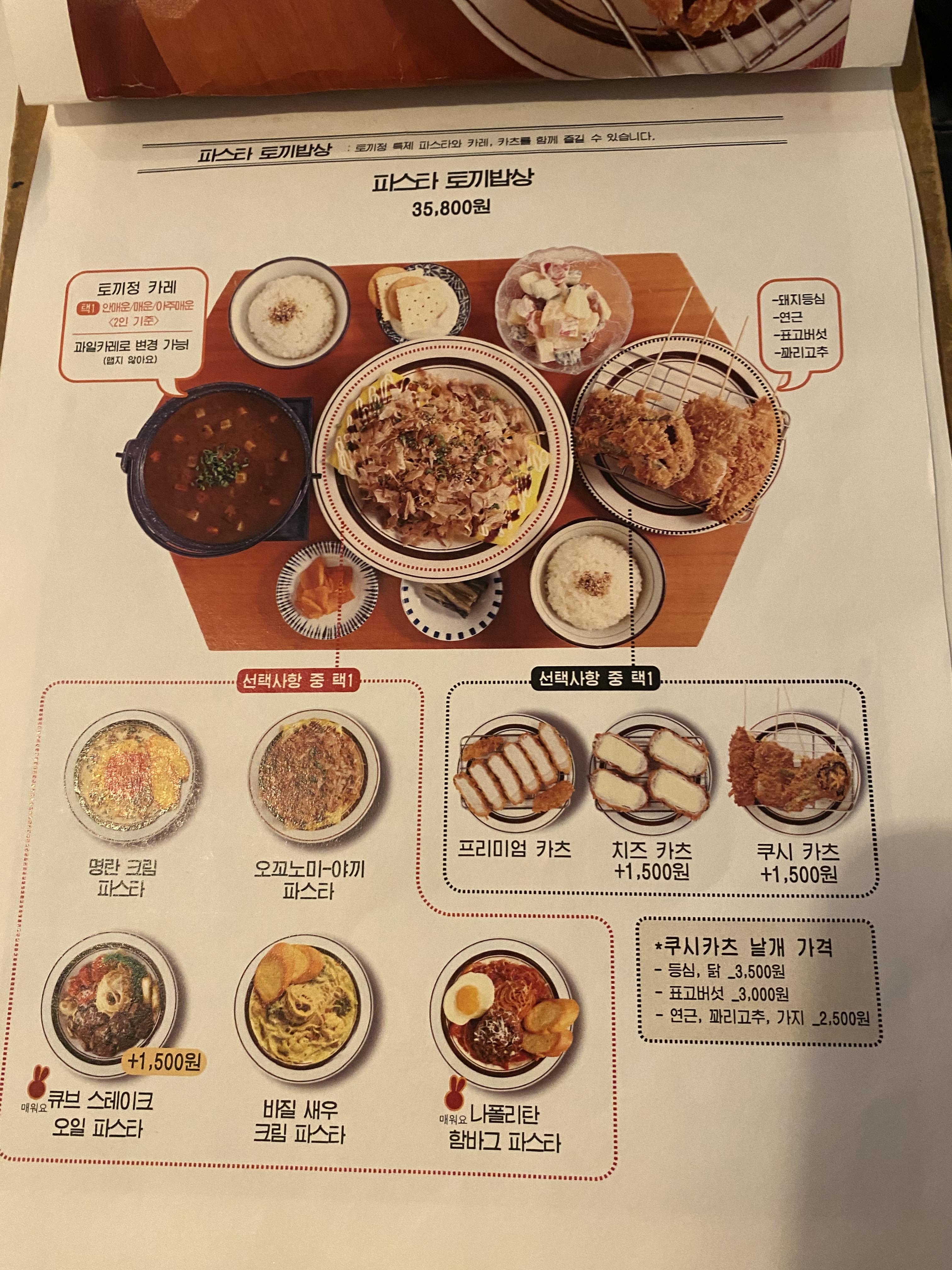 토기정 카레와 파스타를 선택할 수 있습니다. 토끼정 카레는 과일카레로 변경이 가능하며 맵지는 않습니다.