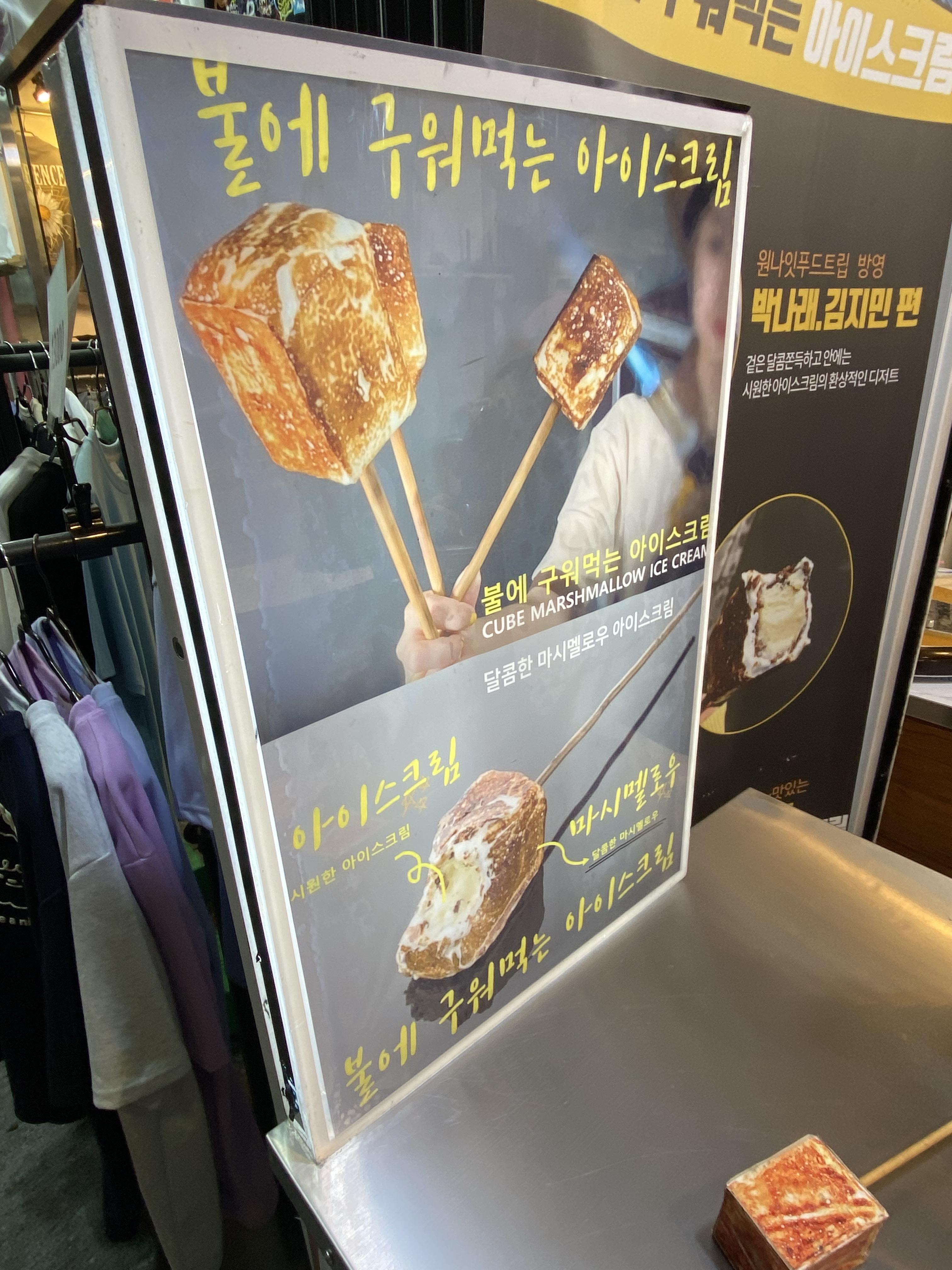 홍대 부근을 지나가다가 마시멜로 아이스크림 간판이 보였습니다. 그걸 본 딸이 불에 구워먹는 아이스크림은 많은 유튜버들이 먹는 모습을 봐서 자기도 먹고 싶다고 해서 사주게 되었습니다.