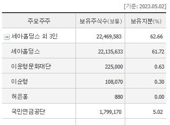 세아베스틸지주는 세아홀딩스가 61.72%, 국민연금공단이 6%의 지분을 보유하고 있으며, 매출액과 영업이익은 꾸준히 성장하고 있습니다.
