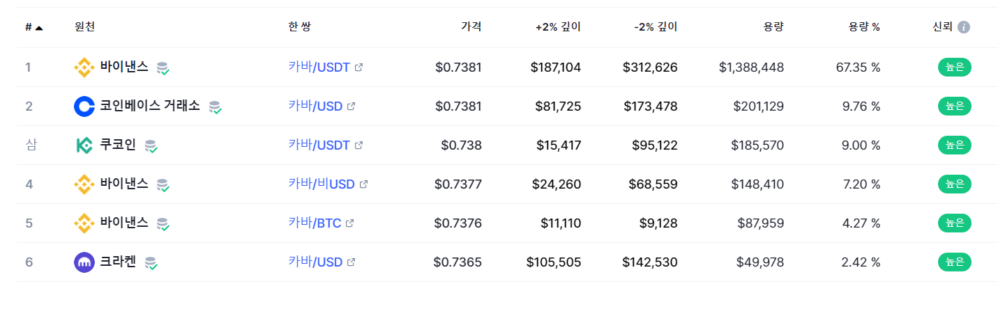 카바는 바이낸스, 코인베이스, 쿠코인 등 해외거래소에 상장이 되어 있는 블록체인입니다. 하지만 해외거래소에서는 0.73달러에 가격을 형성되어 있으며, 업비트에서 가격과는 상당한 가격차이가 발생하고 있는 것을 알 수 있습니다.