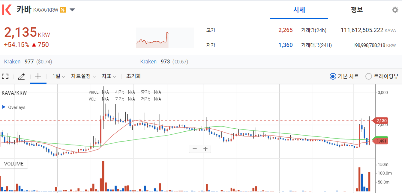 업비트 카바 일봉차트를 보시면 현재 54% 상승을 하면서 업비트 내 코인 중 거래대금 1위를 차지하고 있습니다.