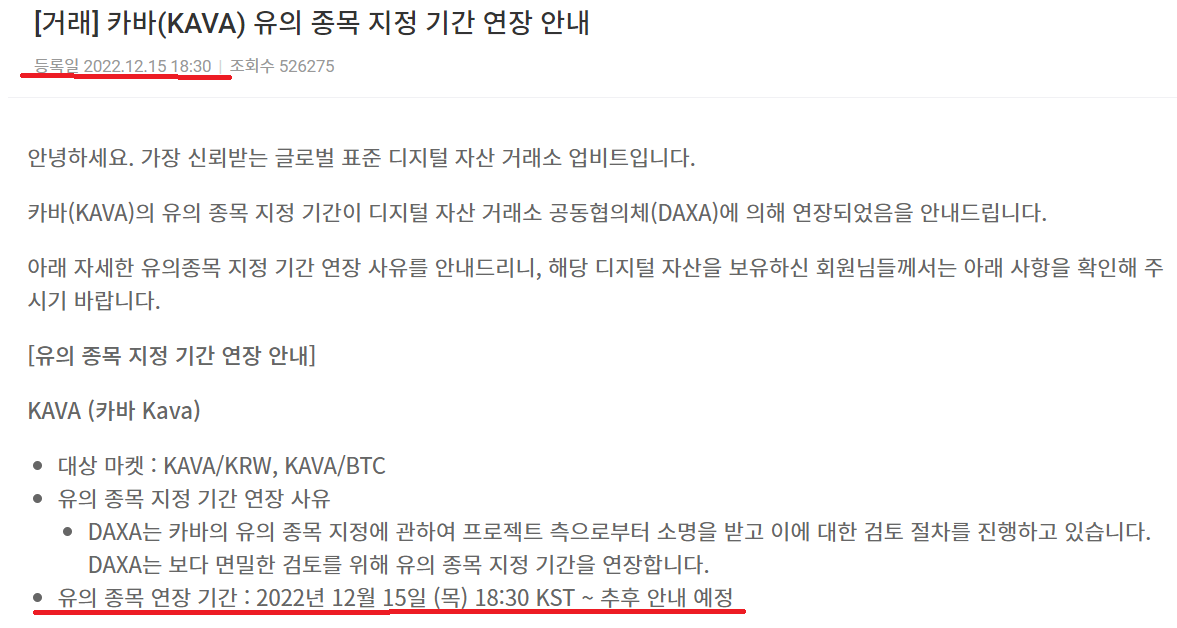 업비트에 상장되어 있는 카바 코인은 2022년 12월 15일에 유의 종목으로 지정이 되었다가 기간을 연장한다는 공지사항을 발표했습니다. 유의 종목 연장 기간은 추후 안내 예정으로만 기재되어 있고 정확한 날짜는 아직 확정된 바가 없기 때문에 약 5개월간의 유의 종목 지정으로 상장 유지를 했습니다.