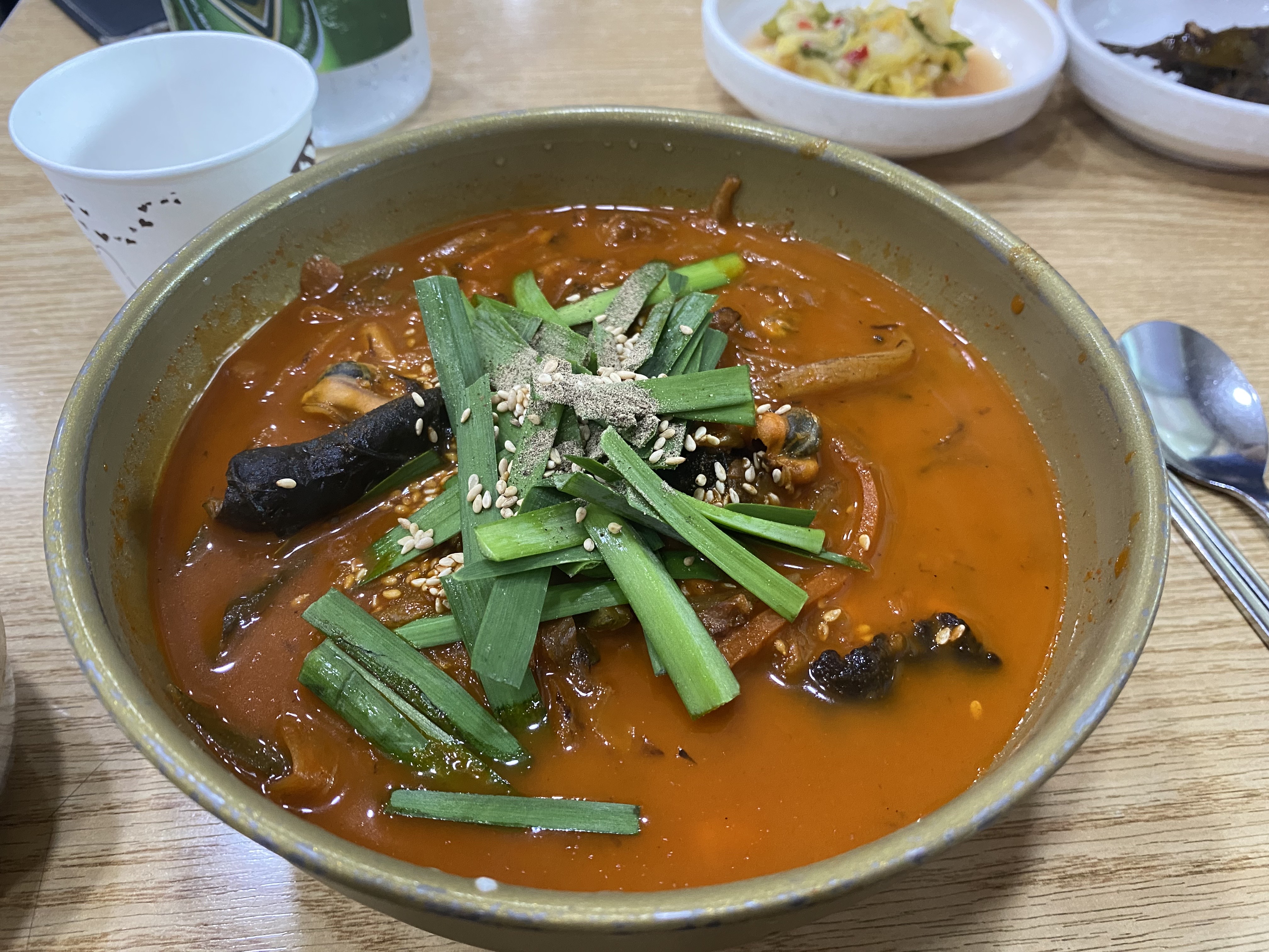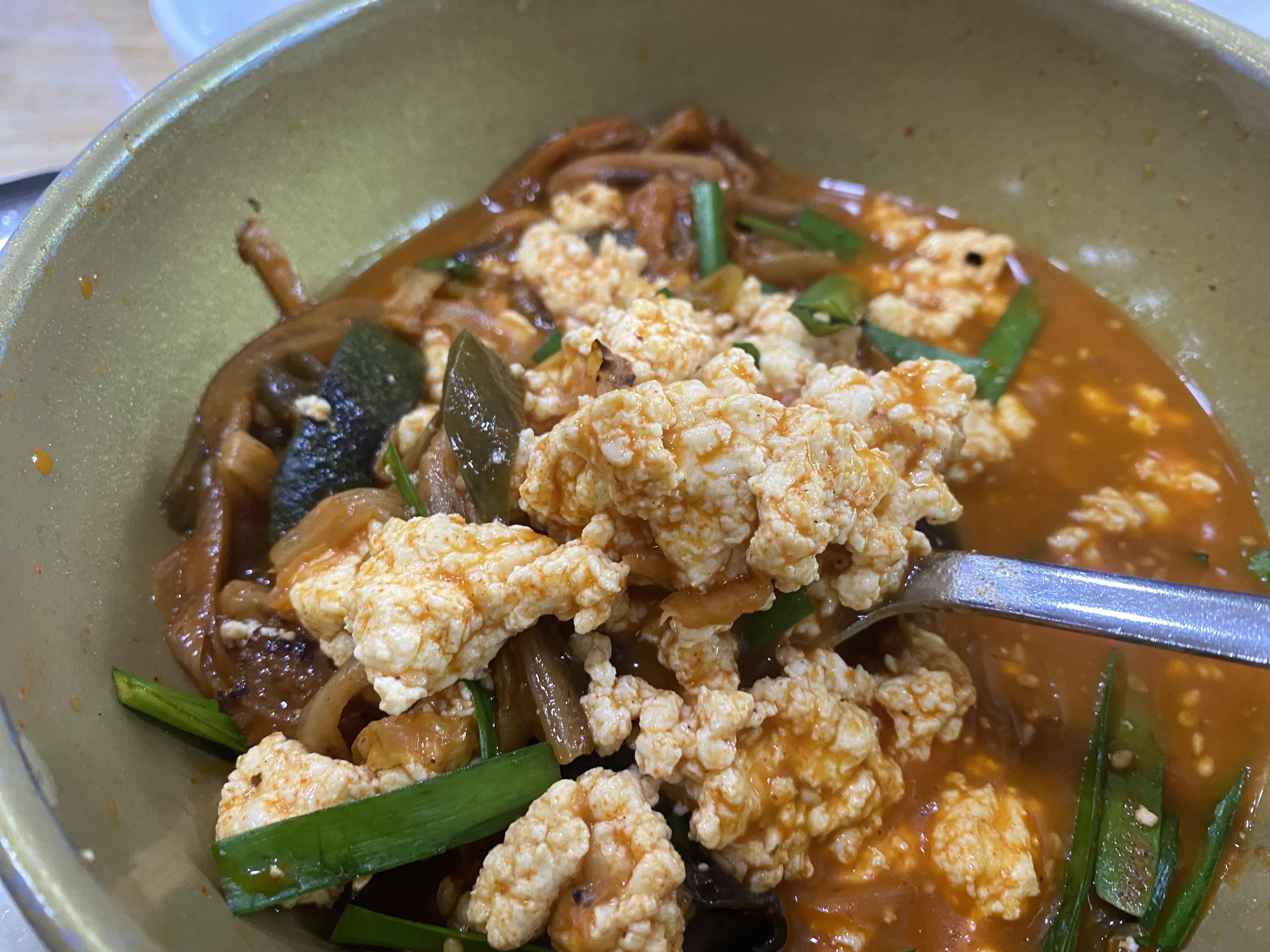 순두부, 부추, 오징어, 양파, 홍합 등이 들어간 짬뽕순두부입니다. 얼큰하고 걸쭉하며, 불맛이 나는 짬뽕순두부는 정말 맛있었습니다. 하지만 그렇게 특출 나게 맛있다는 느낌보다는 어디선가 먹어본 짬뽕 맛이었습니다.