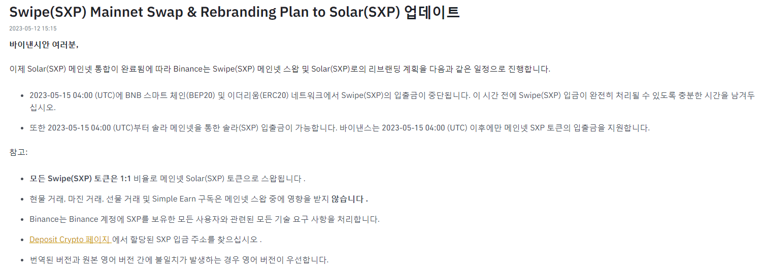 2023년5월15일 04:00(UTC) BEP20 또는 ERC20 네트워크에서 SXP의 입출금이 중단이 됩니다.
