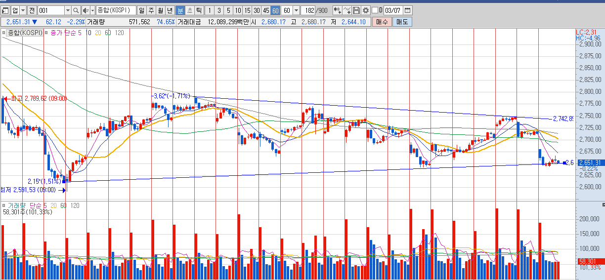 코스피 60분봉 차트를 확대해서 보면 고점은 낮아지면서 저점이 낮아지는