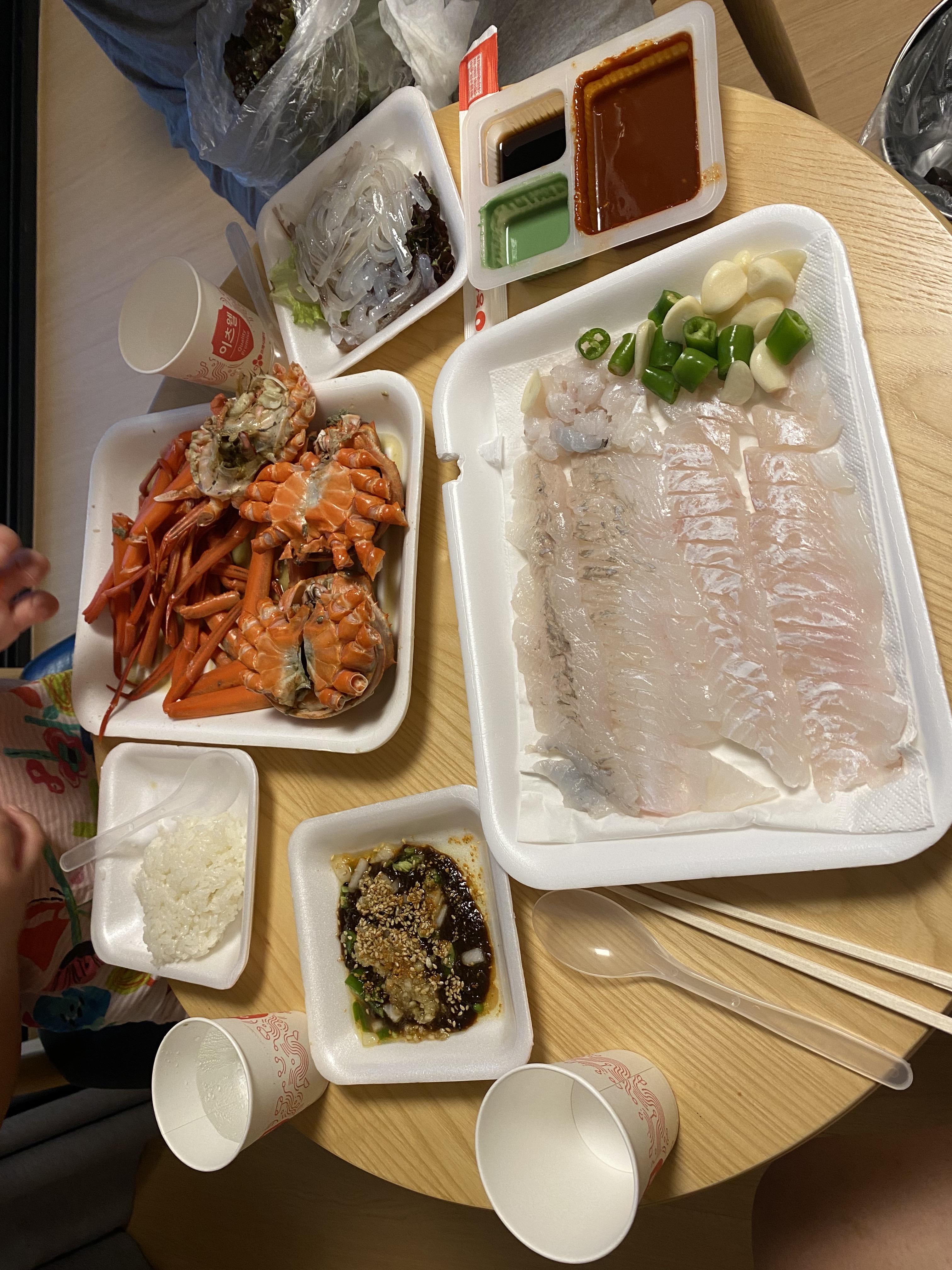 저희가 고른 도다리와 대게는 엄청 싱싱한 상태입니다. 즉석에서 바로 회를 떠주시고, 대게는 바로 쪄서 나옵니다.