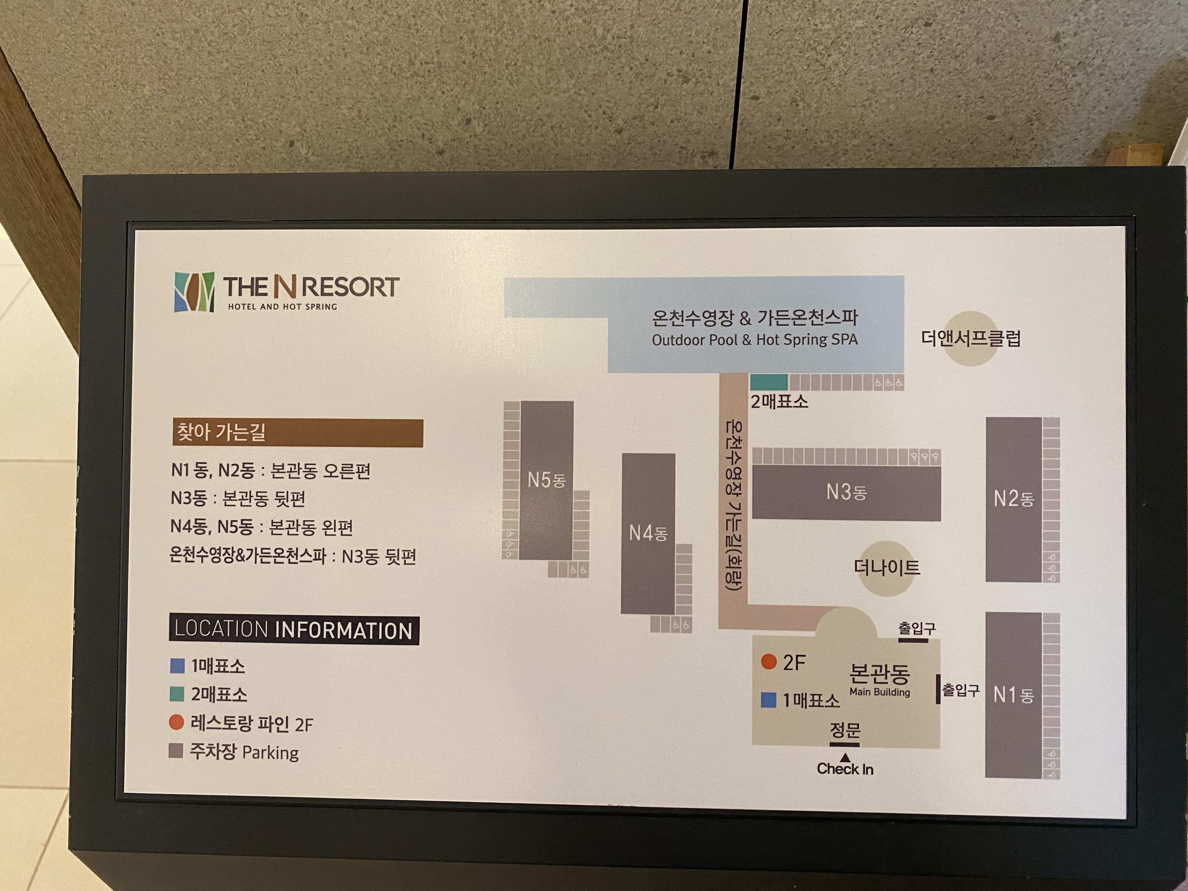 여기서 꿀팁은 N4동이 본관동과 온천수영장을 이용하기에 가장 좋은 위치입니다. 다행히 체크인할 때 안내원이 N4동으로 배정을 해줘서 편하게 이용할 수 있었습니다.