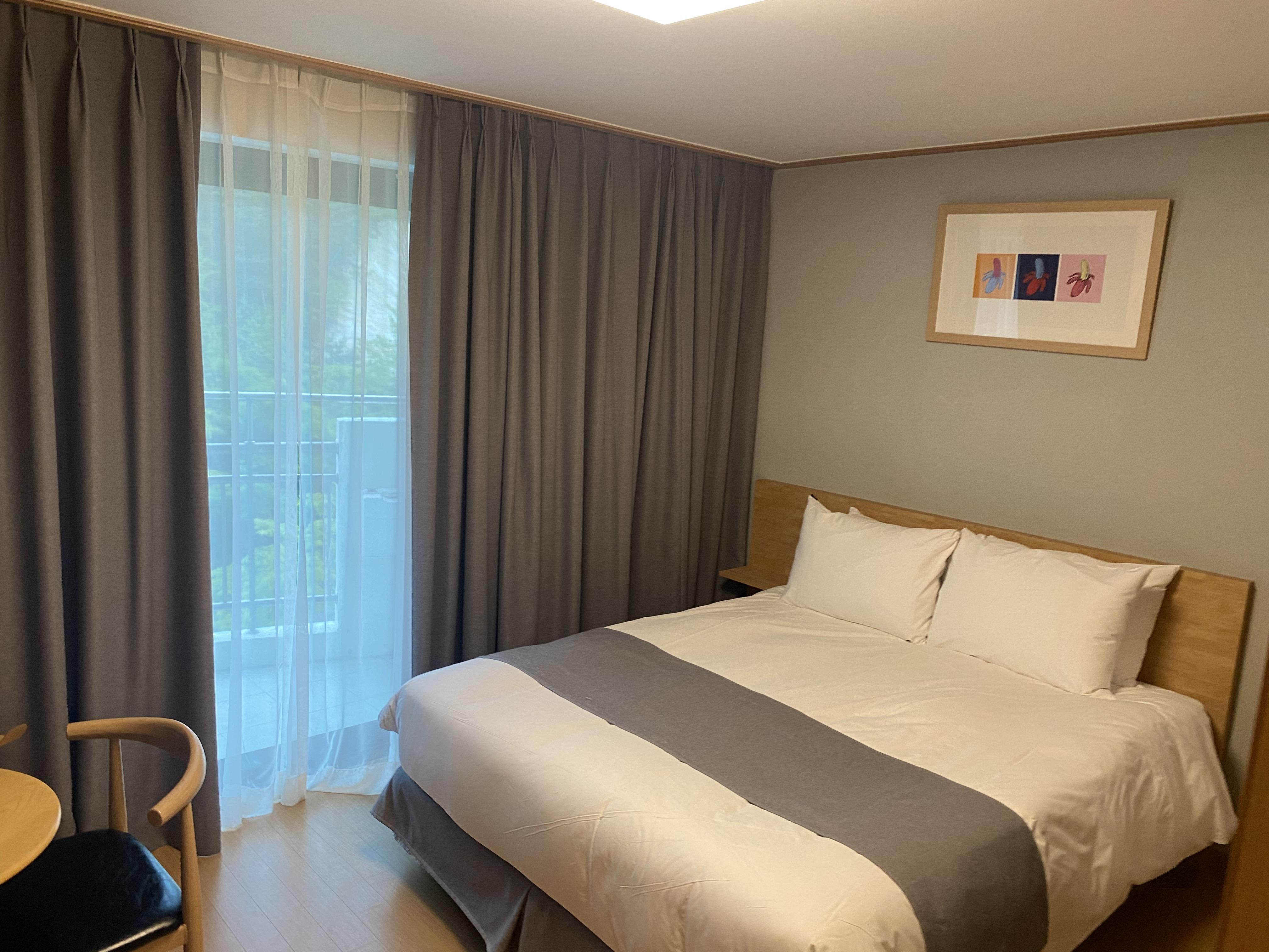 더앤리조트 디럭스 더블은 더블배드와 온돌방으로 구성되어 있어서 가족끼리 오기 적합한 장소입니다. 전 객실에서 사용되는 물은 온천수라고 해서 써봤는데 약간 다른 거 같긴 했습니다.