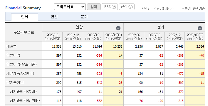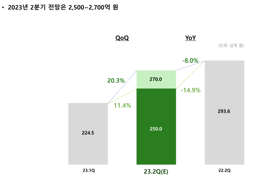 2023년 2분기 전망은 2,500~ 2,700억 원을 예상하고 있습니다.