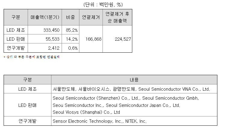 서울반도체는 LED 제조의 매출 비중이 85.2% 정도이며, LED 판매 14.2% 비중을 차지하고 있습니다.
