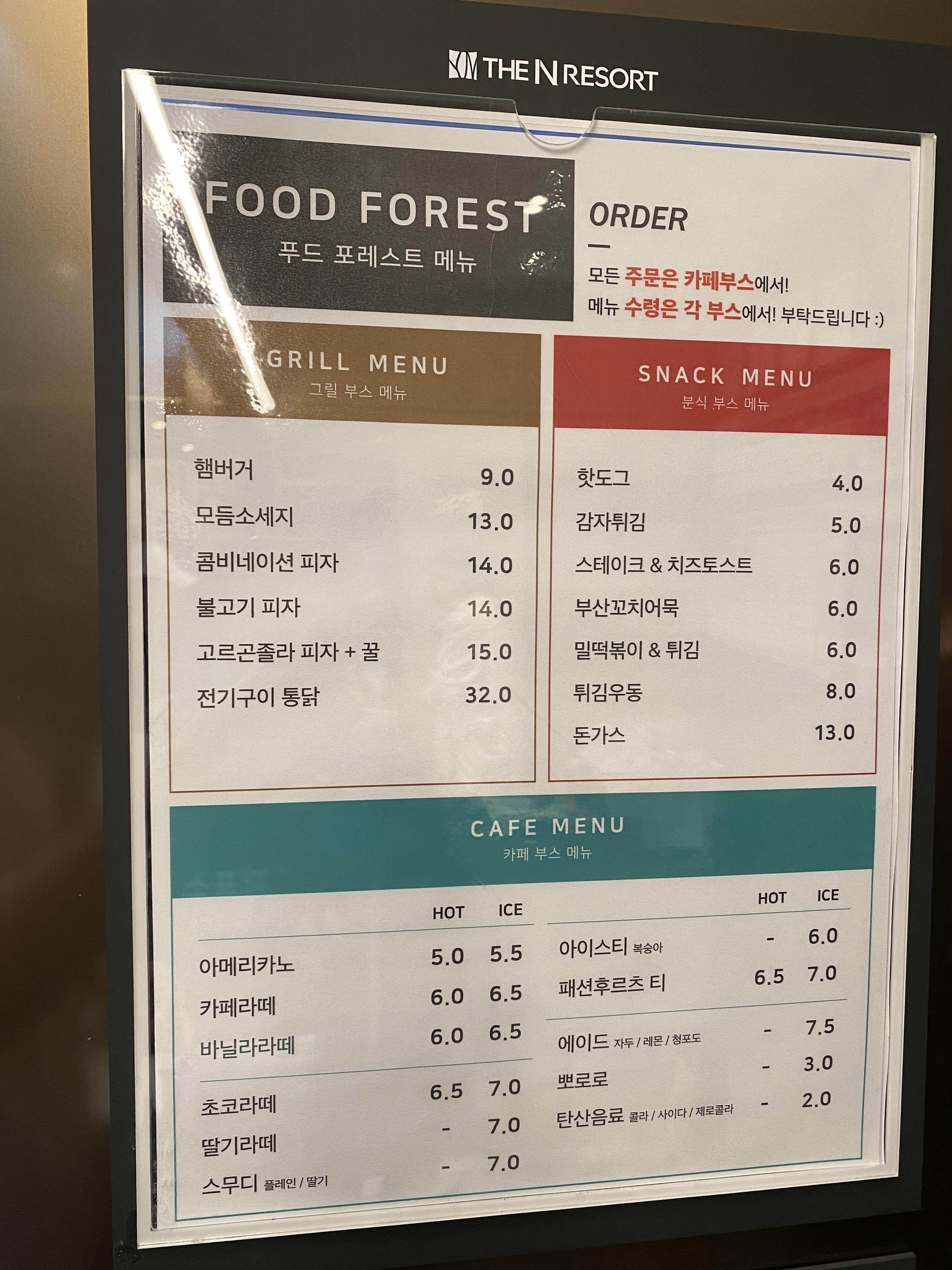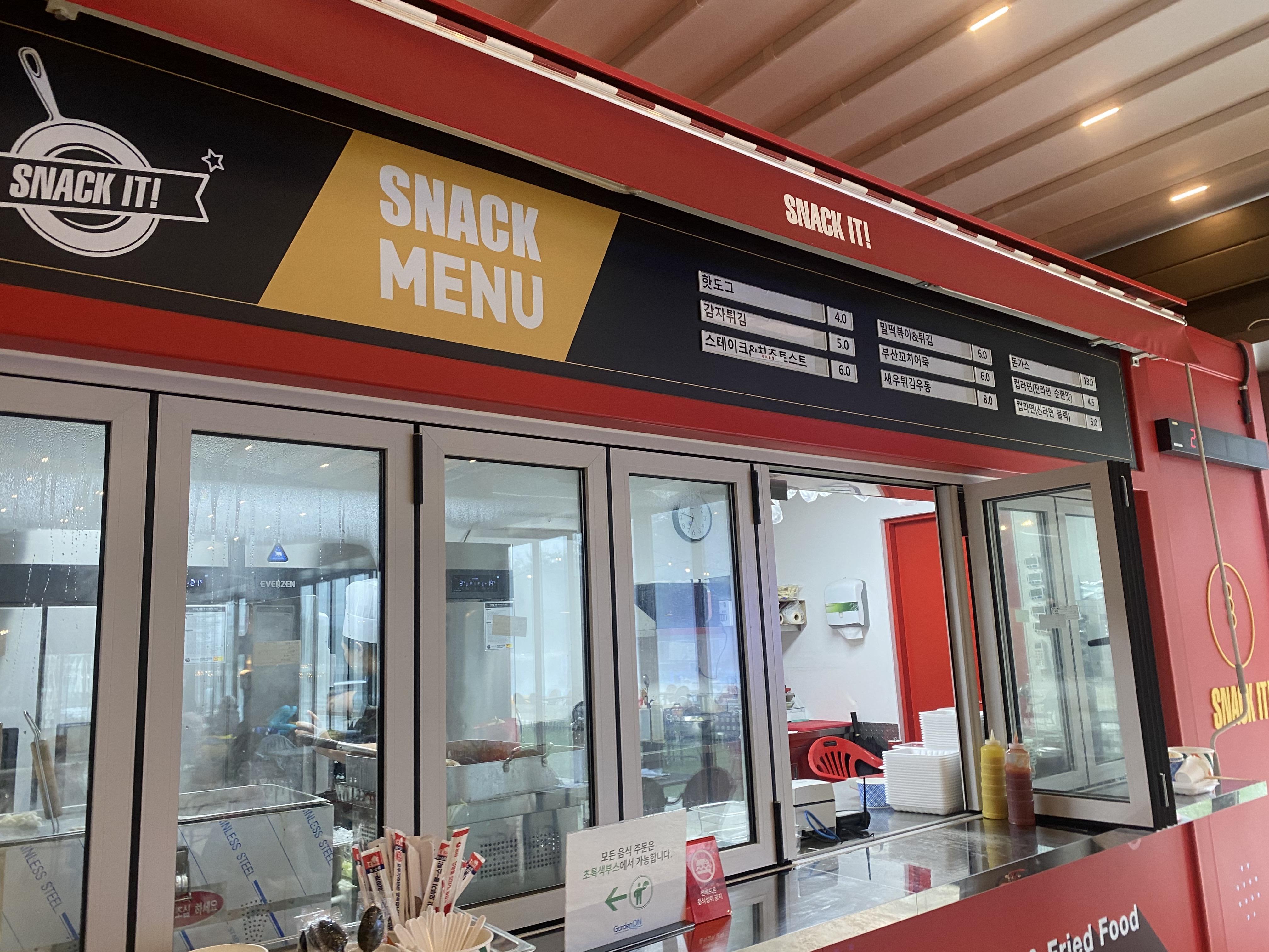 푸드코트에는 햄버거, 소세지, 피자, 핫도그, 스테이크, 떡볶이, 우동, 돈까스, 커피 등을 판매하고 있습니다.