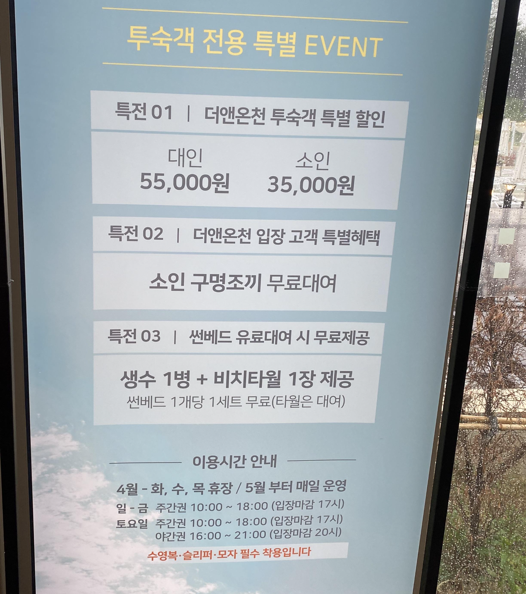 온천을 이용한 수영장이라 그런지 확실히 가격이 후덜덜했습니다. 투수객에 한해서 50% 할인을 적용해도 비싼 거 같았지만 할 수 없이 이용했습니다.